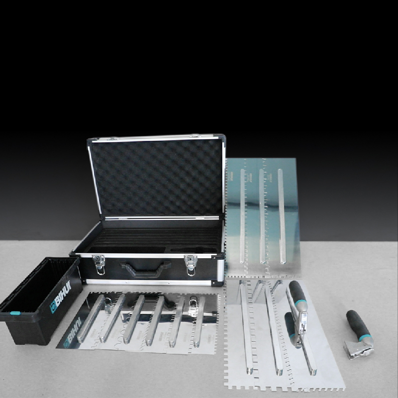 - 6 db Rozsdamentes acél pengéjű glettvas (különböző fogazásokkal, lásd a termékgalériában) 280×115 mm