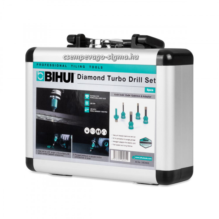 A készletben található fúrók méretei: 6x64, 8x64, 10x64, 12x64 mm, adater