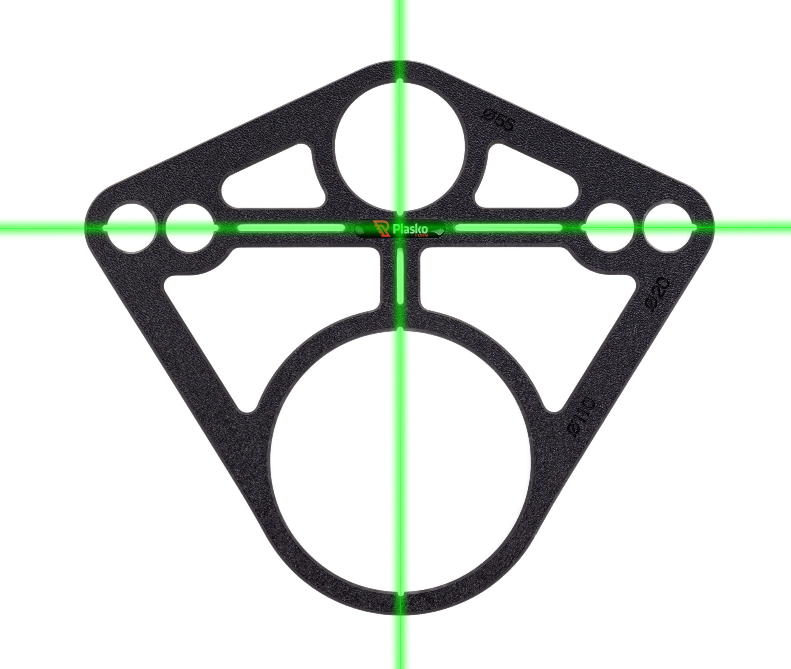 A furatok átmérője 20 mm, 50 mm és 110 mm . Minden furat átmérőjelöléssel, valamint függőleges és vízszintes jelzőkkel rendelkezik, amelyek megkönnyítik a sablon megfelelő helyzetbe állítását .